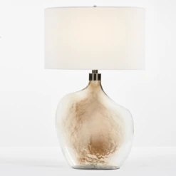 An ethereal expression of modern art, this table lamp embodies the essence of elegance. Creatively contoured glass body abounds with a flowing sense of motion, its intriguing gold tones further enhancing its diaphanous depth.