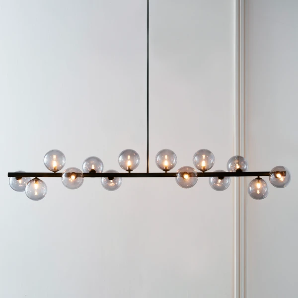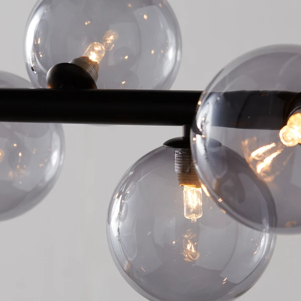 Radiating light in three directions, this chandelier’s linear blackened iron frame and smoky glass globe shades make an eye-catching statement over a dining table or kitchen island.