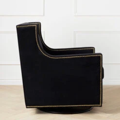 Accented in gold nailheads, this swiveling glider is crafted of kiln-dried hardwood with a boxy, clean-lined silhouette and sloped arms for an elegant, modern look. Ample padding ensures long-lasting comfort and support. Shown in Bella Velvet Black.