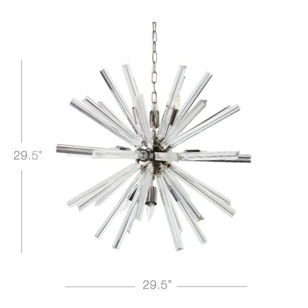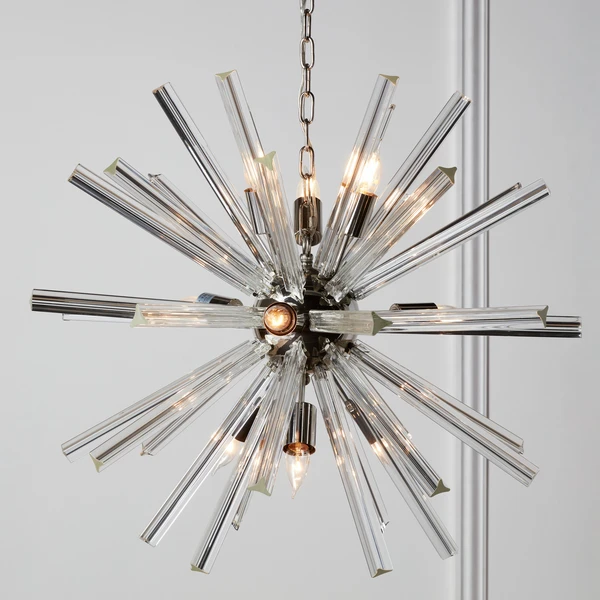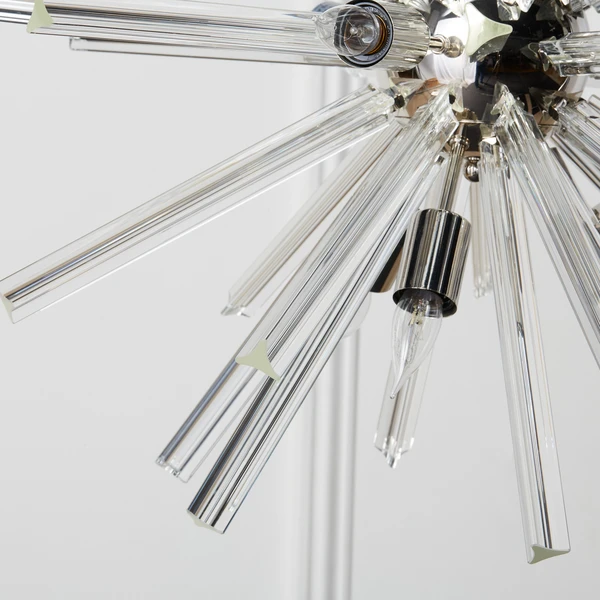 The Axis takes all the style of a modern-day Sputnik-influenced lamp and gives it an elevated look. Large spokes are solid glass in a triangular shape, providing multiple angles for reflection of light.