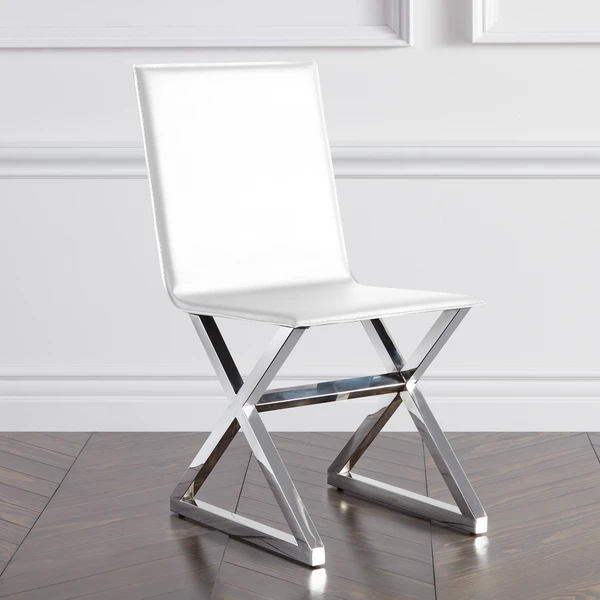 Our Axis collection conveys a contemporary design through its lustrous finishes. The Axis dining chair features a polished stainless steel base and durable bonded leather upholstery. Shown in White.