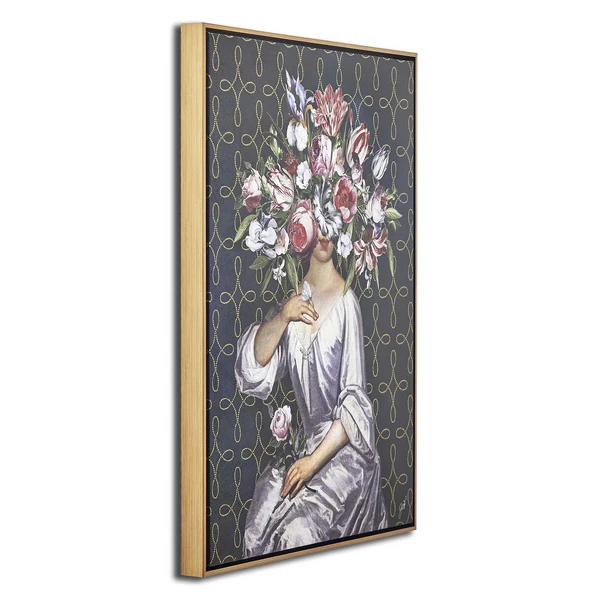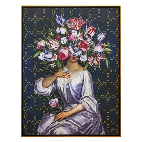Partially obscured by lush flowers, this portrait from artist Jackie Von Tobel adds a whimsical note to any wall. Printed on canvas with an image brush gel finish for added texture, this piece is displayed in a gold floater frame.