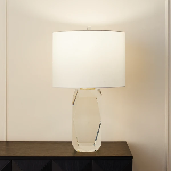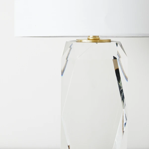 Classic and refined, this table lamp is crafted of clear crystal with subtle facets that beautifully reflect the light. A white drum shade accented with soft brass hardware to complete the look.