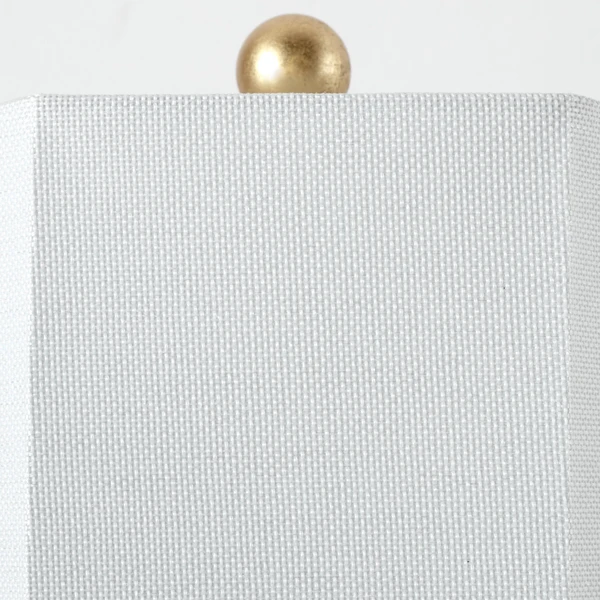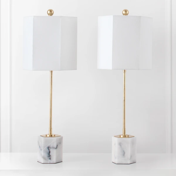 Finished in gold leaf, these stunning table lamps are perched on marble bases that mirror the hexagonal shape of the off-white shades.