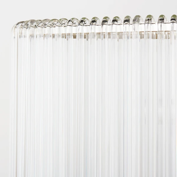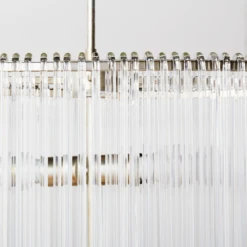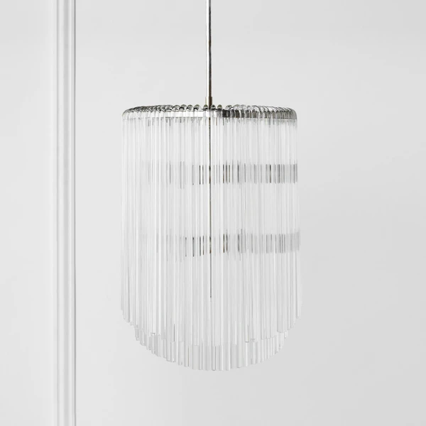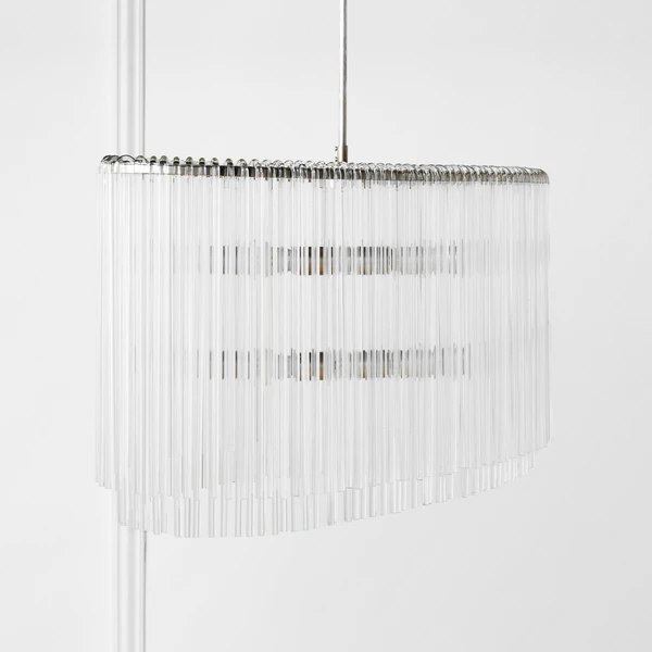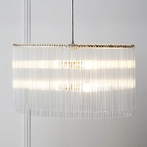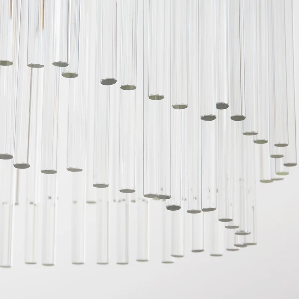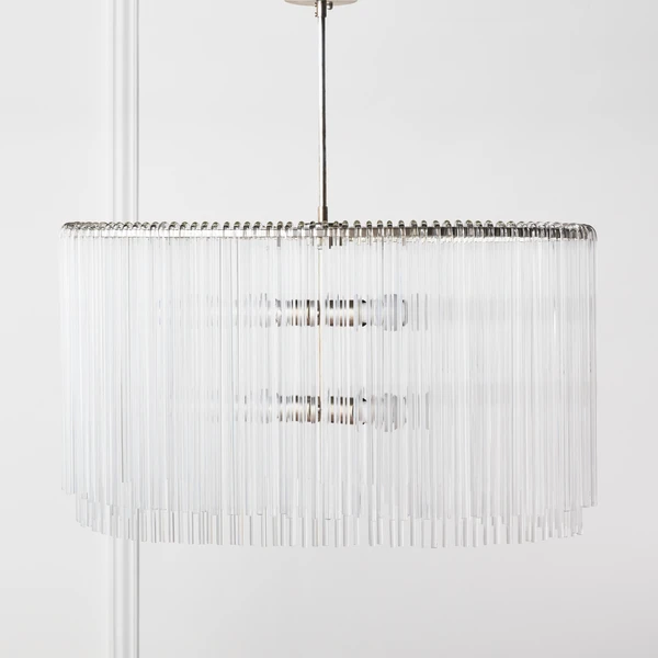 Our exclusive linear glass Cascada Chandelier is the perfect balance of clean design and shimmering charm. More than 100-pieces of hand-bent glass are draped over Cascada’s champagne leaf-finished frame, for a layered effect that will be the talking point of your room.