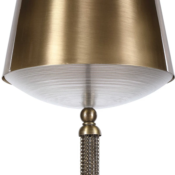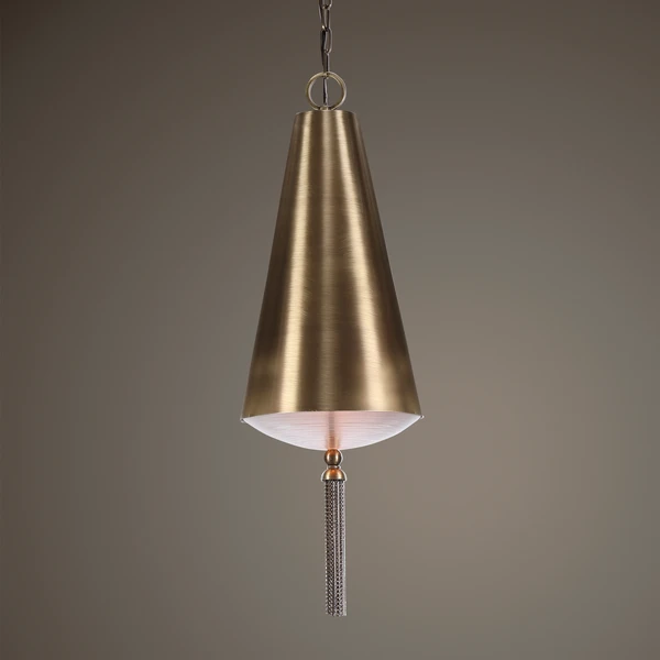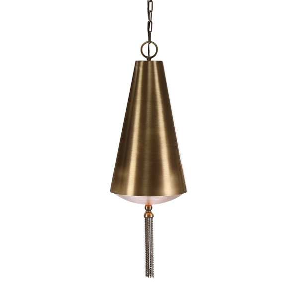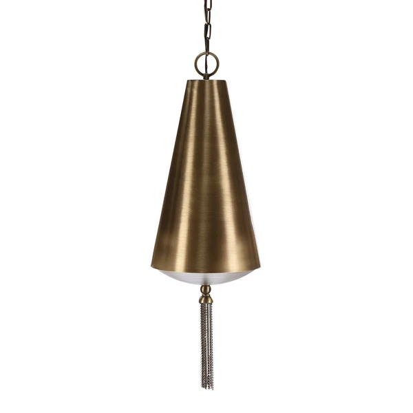 Pendant with a flared cone shade in antique brass with convex concentric circle glass diffuser and a wonderful antique brass, oversized tassel finial.