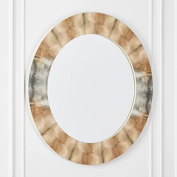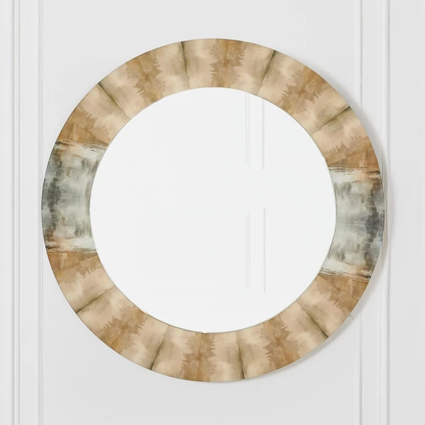 Inspired by cloudscape paintings, this mirror’s round frame is finished with a soft wash of color in gradients of taupe and blue, making it a brilliant, neutral accent for any wall.