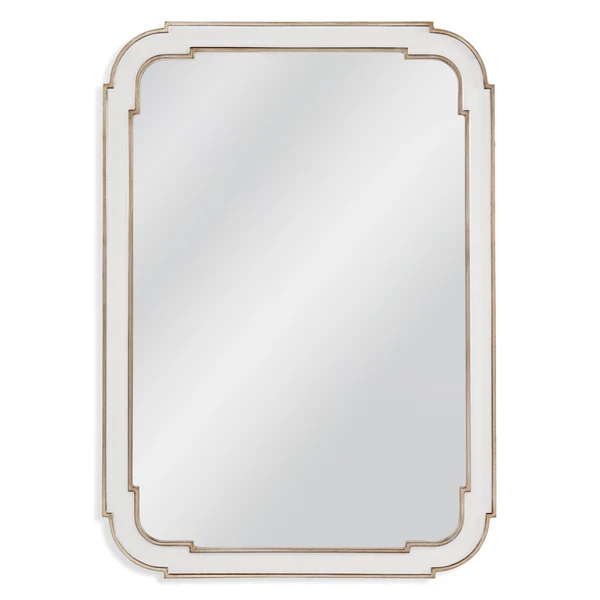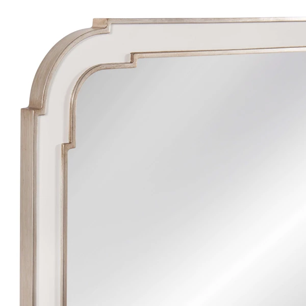 Our Concord Mirror features a raised silver leaf detailing and white lacquer.