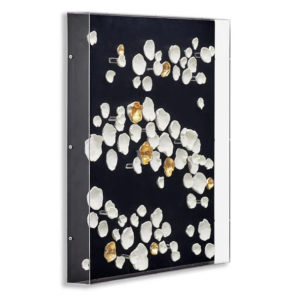 Resembling a starry sky, this artful arrangement of white and gold sculptural elements is mounted on black fabric and displayed in an acrylic shadowbox frame.
