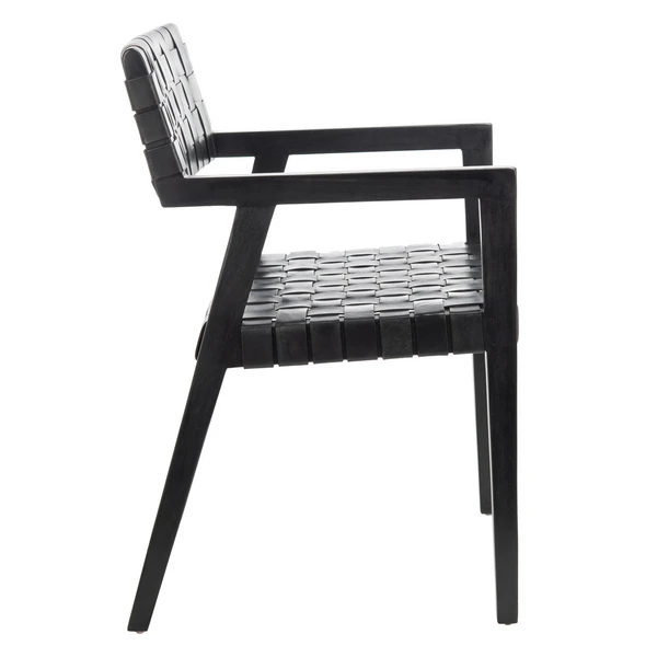 With its angled mahogany framework, woven leather seat, and black finish, this chair brings sleek, contemporary style and comfort to the dining room.