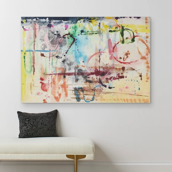 This beautifully layered abstraction from artist Jean Kenna showcases bold, expressive brushstrokes and brilliant pops of color. Printed on canvas with a hand-applied image brush gel finish for added texture, this piece hangs both vertically and horizontally.