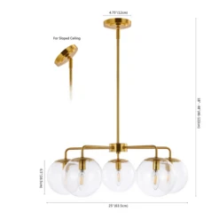 Transform your décor with the unique elegance of this chandelier. The visible bulbs inside the clear glass shades lend a fun retro feel to its industrial-chic brass frame, casting a stylish glow above the dining room table or in the fashion-forward bedroom.