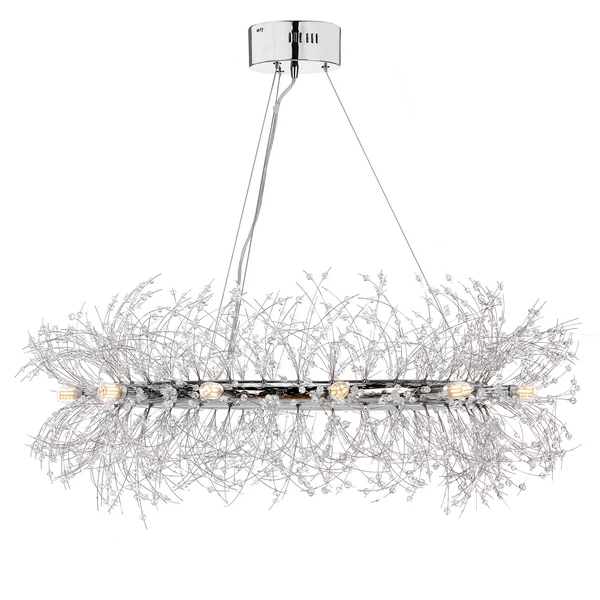 Allow us to be crystal clear. Sophistication meets whimsy in this ethereal secret-garden-inspired crystal chandelier, aptly named Fleur. A wreath of light-reflecting crystal beads appears to float in thin air thanks to artful steel suspension cables.