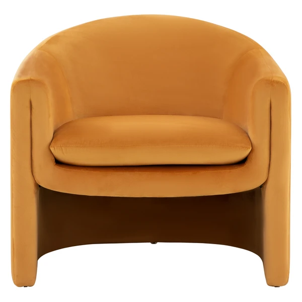 With its plush velvet upholstery and modern, sculptural silhouette, this barrel-back accent chair makes a standout addition to any space.