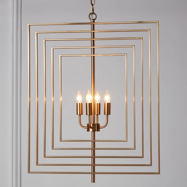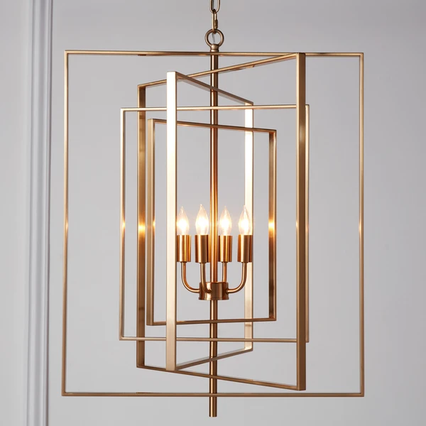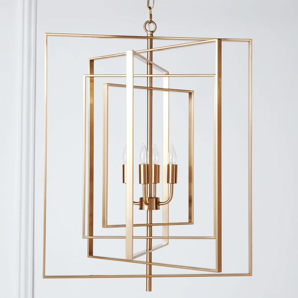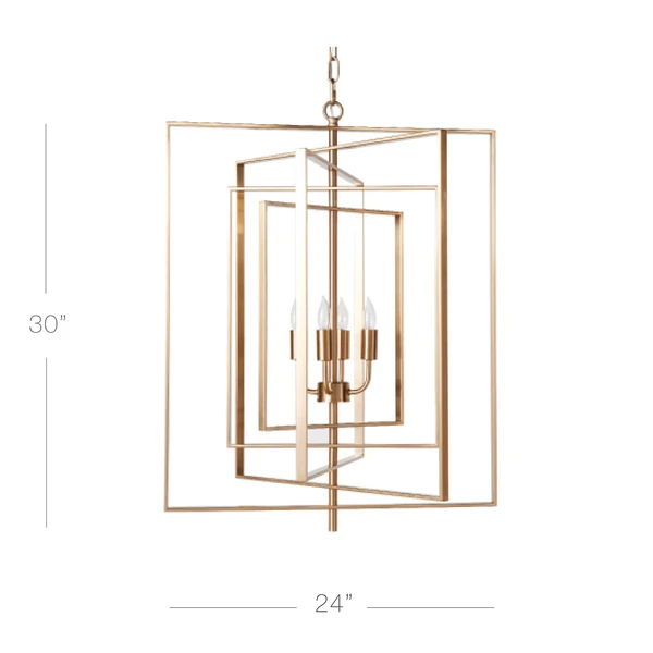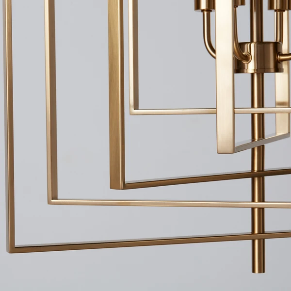 Perfect for modern and minimal spaces, our four-light Hollis Chandelier features a brass-finished metal in a clean-lined geometric frame.
