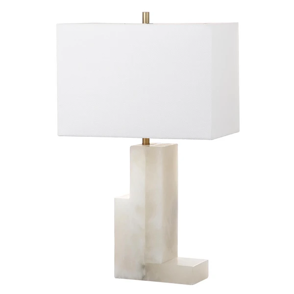Set below a boxy cotton shade, this table lamp flaunts a naturally stunning marble base with a stepped design.