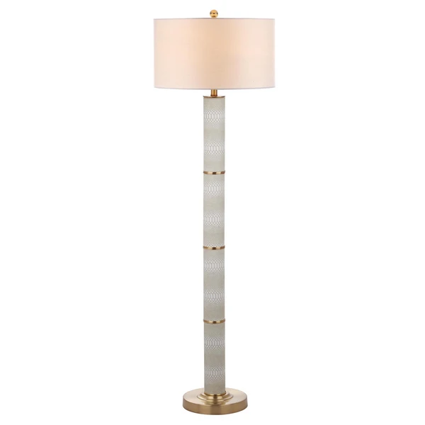 Topped with a cream cotton shade, this floor lamp features a leather like body with a textural snakeskin design. Narrow brass-finished bands add a luxe touch.