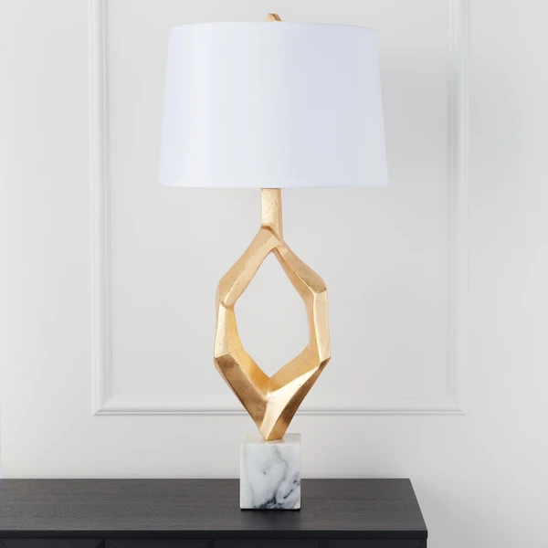 Set on a marble pedestal, this table lamp makes a statement with its sculptural design and gleaming gold finish.