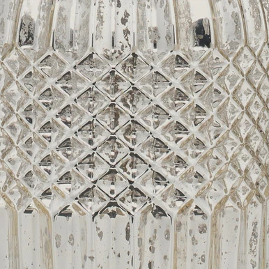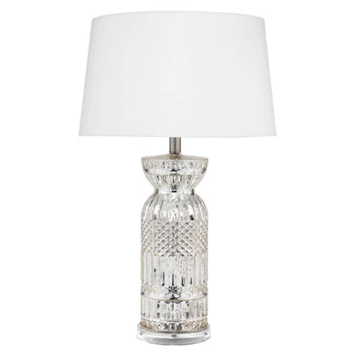 This antique mercury glass table lamp is an elegantly patterned contemporary lamp with a traditional aesthetic resting on a clear acrylic base.