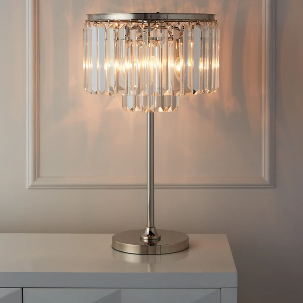 Sophisticated and refined, our Luxe Lighting Collection layers your décor with a stunning glow of light. Crafted out of ocular glass for maximum opulence, each of the independently hung faceted prisms on the Table Lamp stunningly reflect and embellish the surrounding light. Three lights in total make for a grand statement when lit, casting magnificence into its surroundings. Coordinate with our Luxe Chandelier or Luxe Floor Lamp for even more impact.
