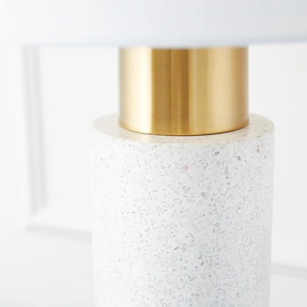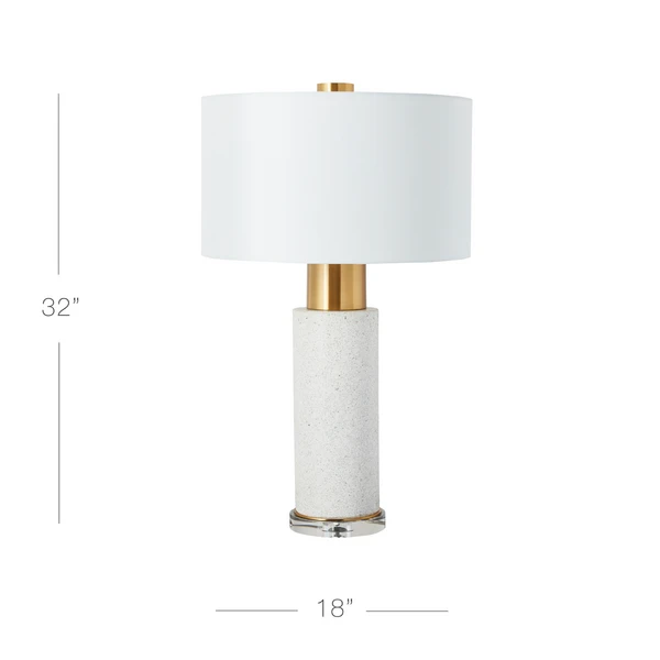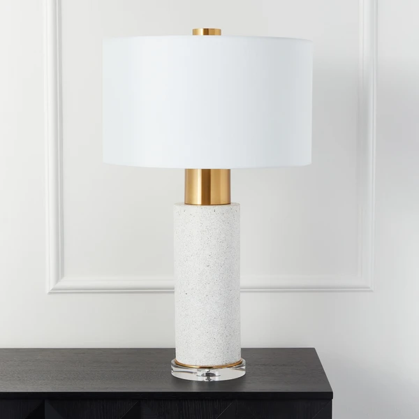 Cool and contemporary, this table lamp’s columnar base is crafted of polished concrete with a bleached wash and accented with brushed brass for warm contrast. A thick crystal base and white linen drum shade complete the look.