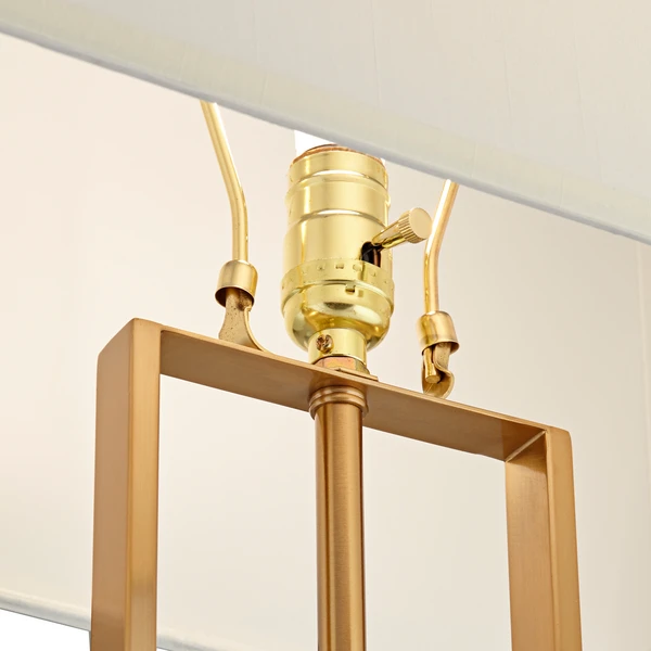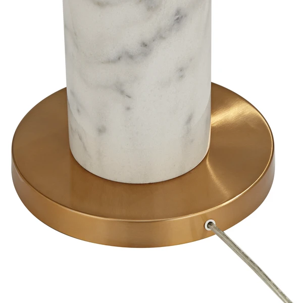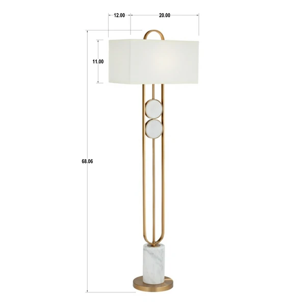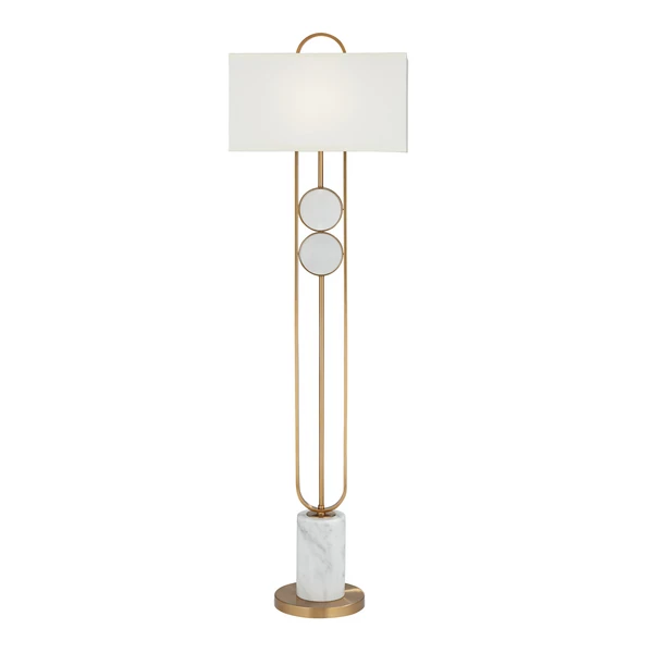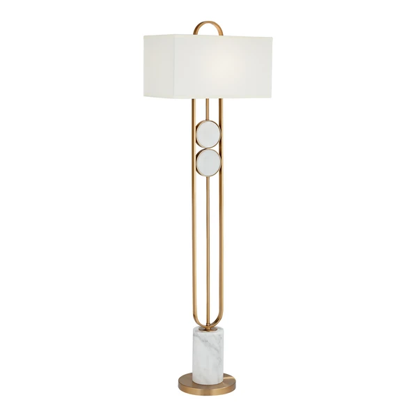 Artful indulgence features tempting design elements that transform this decadent floor lamp. Embrace a modern light source with an open concept oval warm gold finish metal frame and round base, a marble cylinder accent and dual framed disks that stand out to be noticed. A rectangular shantung box shade offers proportionality.
