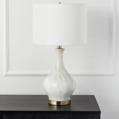 This classic single gourd table lamp with a hand applied faux marble white and grey glaze on a ceramic base with ant brass accents is modern and traditional.