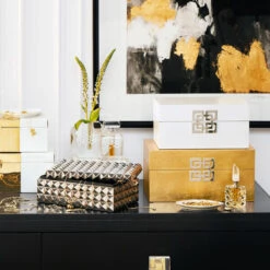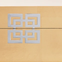 Storage so stylish that it dare not be relegated to the closet. Our Ming Storage Boxes are designed exclusively for Z Gallerie, with a focus on utility but an eye on fashion for your home. These sturdy wooden boxes are richly covered in a gold leafing, providing a lustrous metallic hue. The lids are finished with a decorative geometric medallion and metal hinges at the back.