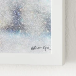 - Glossy art print crystalized with a fine diamond dust finish, mounted within a high gloss white wood shadowbox frame, and set under plexiglass.
