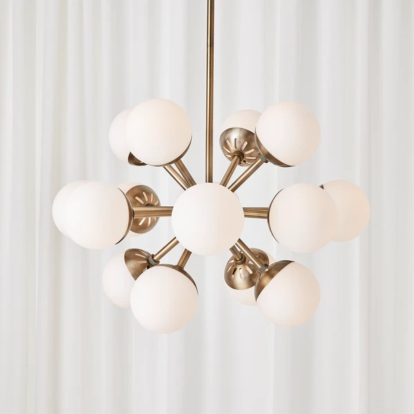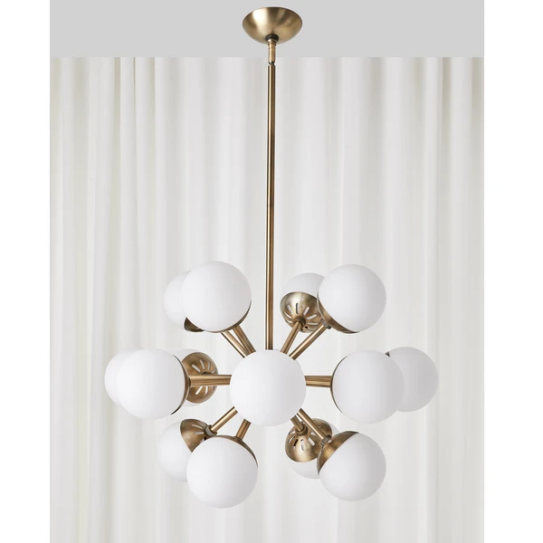 Designed with Mid-Century roots a sputnik center structure finished in a warm antique brass and accented with 5″ Matte White Opal globes yields a modern take on vintage style. 16-60 watt max G16.5 candelabra sockets.