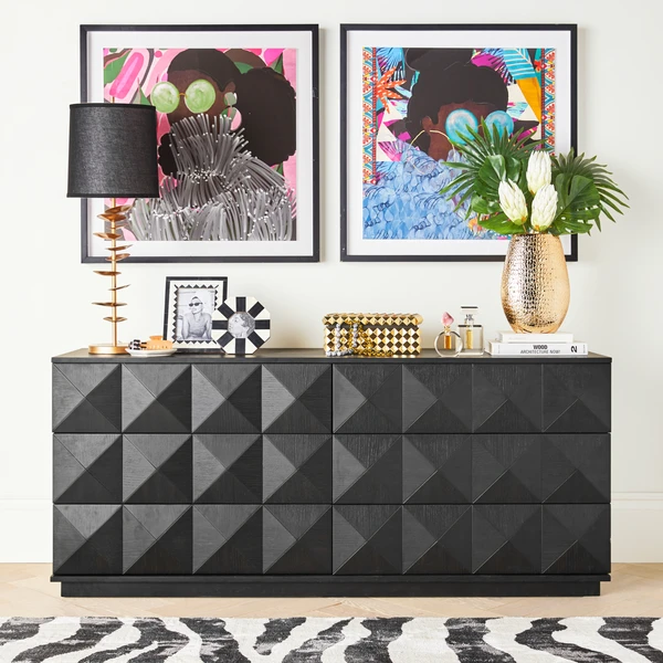 Nikki Chu has gone global with the design of the Abeba Table Lamp. The sculptural gold-plated metal base is topped with a black cotton taper shade and metal ball finial in gold finish. We love this lamp paired with the matching floor lamp and animal prints!