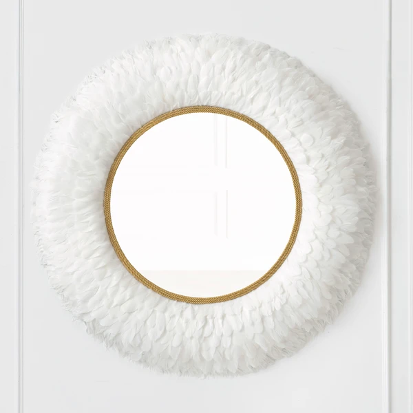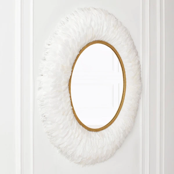 Perfect for adding texture and drama to your wall, this mirror’s frame is embellished with lush feathers and finished with a gleaming gold inner border.