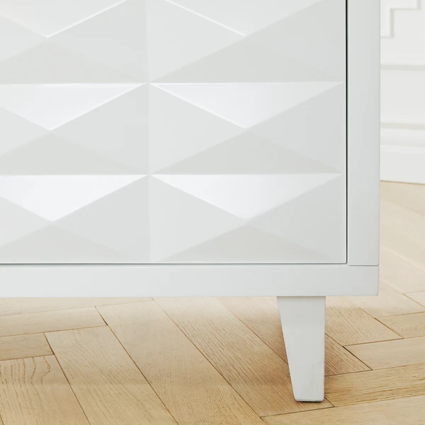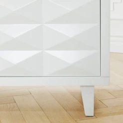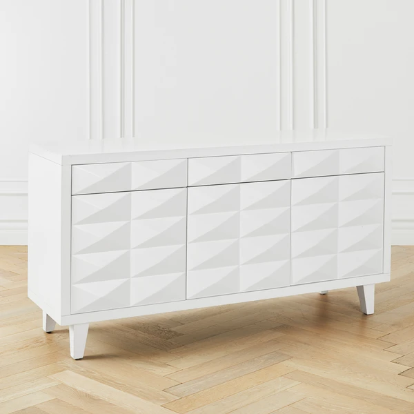 Take your storage space to the next level with our clean-lined, all-white, three-drawer Palmer Cabinet. Constructed in hardwood, featuring a front geometric design and allover sheen to enhance every angle.