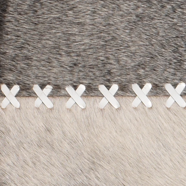 Simple yet impactful, this mirror’s round frame is covered in luxe grey hair-on hide with white leather whip-stitched accents.