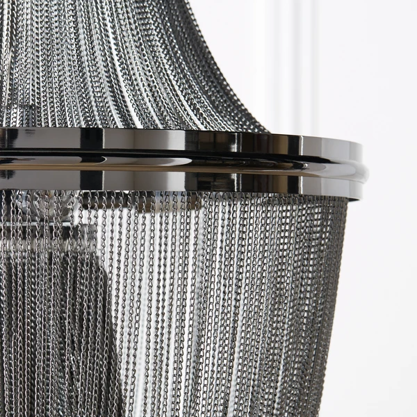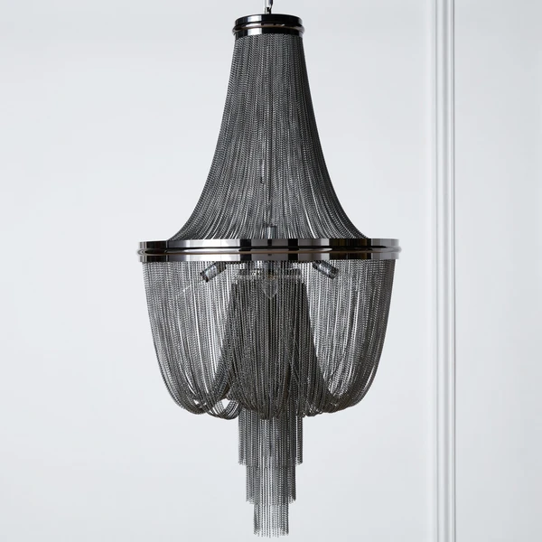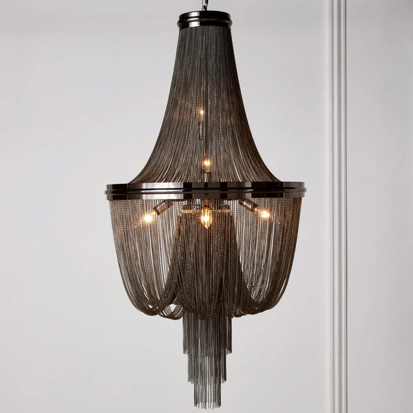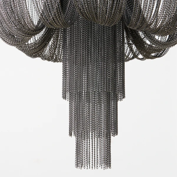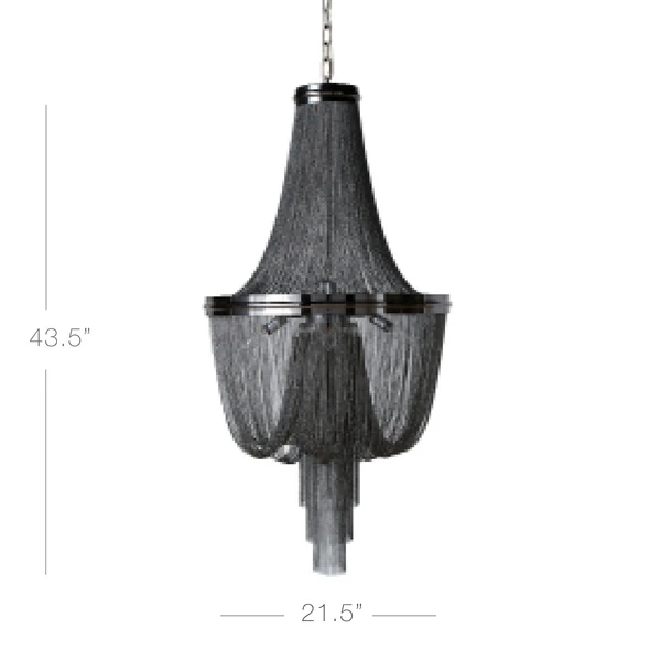 A showstopping addition to any space, this chandelier’s traditional silhouette is given an edgy, modern update with scores of chains draped on its iron frame. A cool graphite finish completes the look.