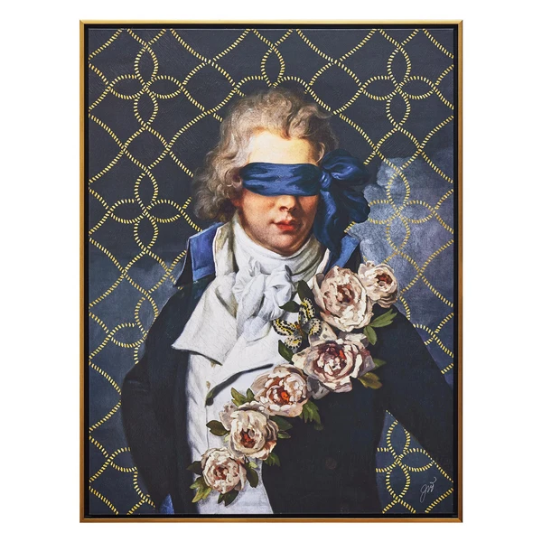 Partially obscured by a blindfold and lush flowers, this portrait from artist Jackie Von Tobel adds a whimsical note to any wall. Printed on canvas with an image brush gel finish for added texture, this piece is displayed in a gold floater frame.