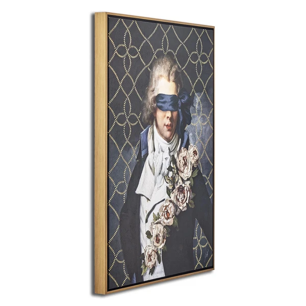 Partially obscured by a blindfold and lush flowers, this portrait from artist Jackie Von Tobel adds a whimsical note to any wall. Printed on canvas with an image brush gel finish for added texture, this piece is displayed in a gold floater frame.