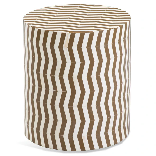 The Seneca Accent Table is a round scatter table with a chevron patterning alternating natural bone and grey resin.