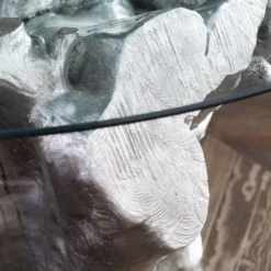 Invite natural looking elements into your home with luminescent Sequoia Dining Table. Carefully cast from the roots of an Acacia tree, our Sequoia Dining Table brings sculptural detailing to its surrounding décor. Moulded out of resin in a multi-step process, our Sequoia Dining Table is finished in silver leafing, giving the table base a subtle luster. A sixty inch round glass table top completes the table, allowing for easy viewing of the stunning organic display below.