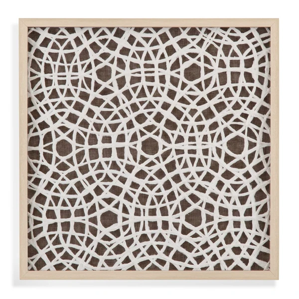 Our Stowe Wall Decor is a shadow box accentuated with a rice paper-like brown mat and a circular radiating pattern of woven white rattan with a natural blonde molding. This piece of art is hand painted by a skilled artist lending itself to a unique technique and will vary slightly.