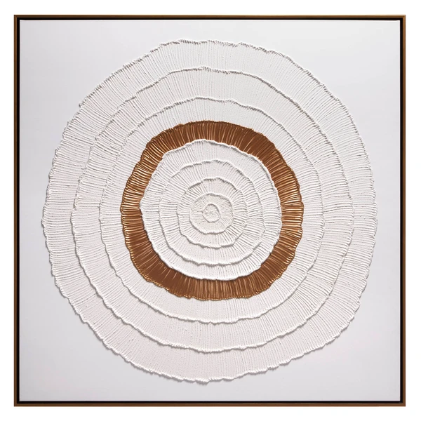 Bold brushstrokes in bright white and gold add an incredible element of texture to this original work by artist Beverly Fuller. Painted on canvas, this piece is displayed in a floater frame.