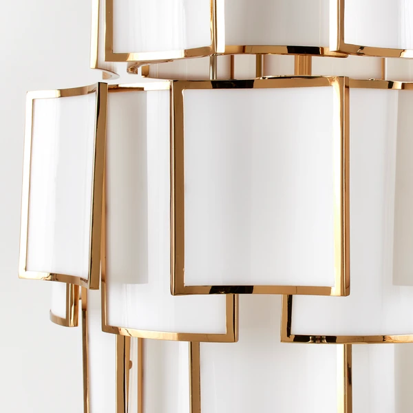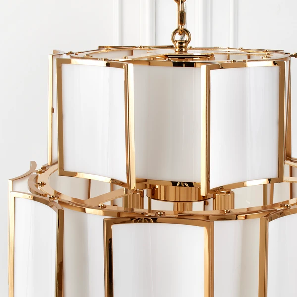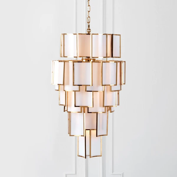 Featuring a cascade of curved white acrylic pieces edged in gold, our Vera chandelier is guaranteed to steal the spotlight in any room.
